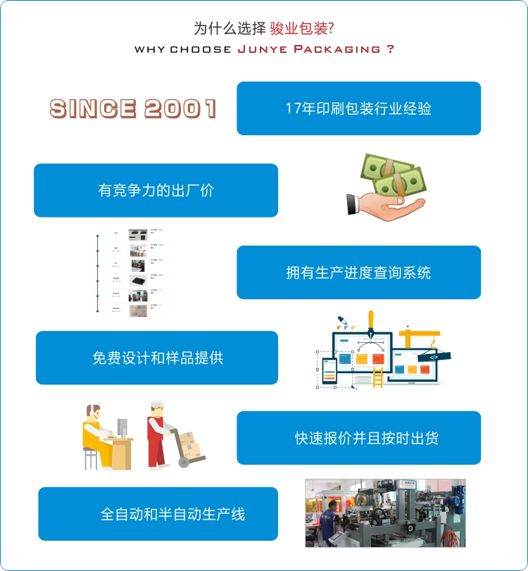 廣州駿業(yè)包裝實(shí)業(yè)有限公司創(chuàng)建于 2001年,是一家以印刷包裝制品為主營業(yè)務(wù)的集設(shè)計(jì)、生產(chǎn)、銷售為一體的一般納稅企業(yè),主要生產(chǎn)各種精品包裝盒、紙袋、吊牌,其主要應(yīng)用于服飾、皮具、化妝品、保健品、禮品、首飾、茶葉、酒類、電子產(chǎn)品及其它日用制品等行業(yè),并通過了德國萊茵認(rèn)證、BV認(rèn)證、SGS認(rèn)證和WCA認(rèn)證.
