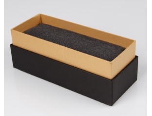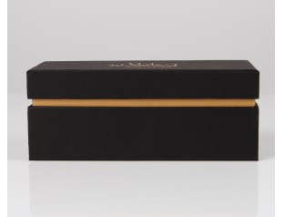 帶圍邊天地蓋禮品包裝盒,采用特種紙裱1000g灰板紙,商標燙金禮品盒內盒采用復合海綿內托,手感細膩,具有較強的回彈性,持久使用不易變形禮品盒包裝設計,選擇黑色作為盒身的底色,醒目的金色LOGO居中,高檔大方。